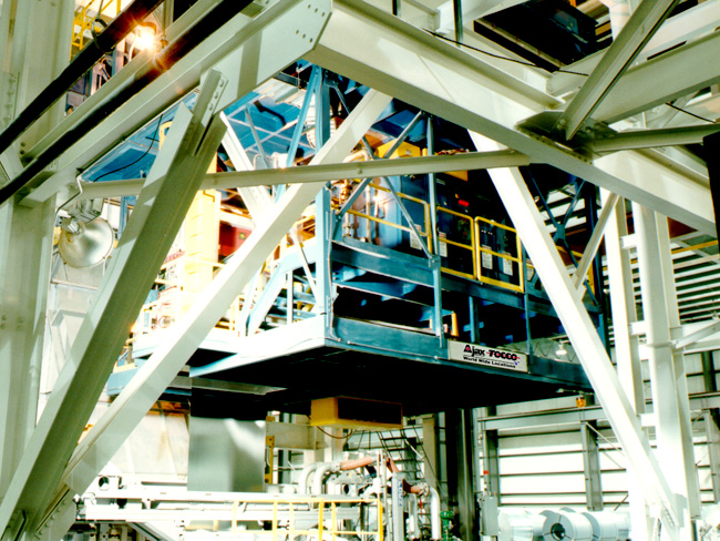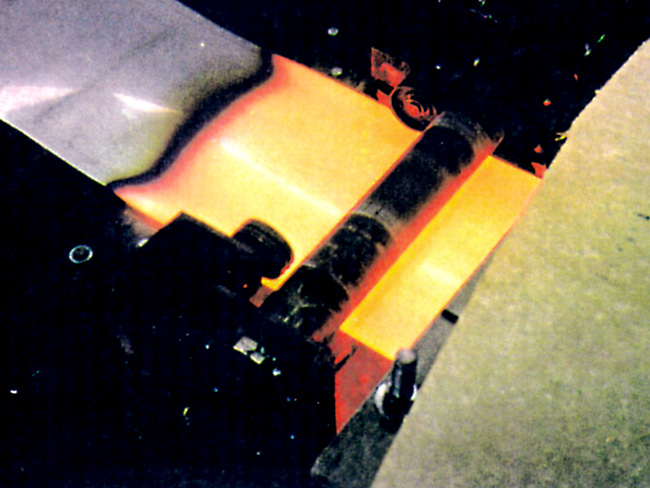 メッキポット内でコーティングされたストリップは薄板加熱装置に入り再加熱されます。これを合金化と呼び、ストリップとコーティング材とが合金化することにより耐食効果を向上できます。薄板や厚版、また幅狭や幅広のストリップを効率よく加熱することが可能です。